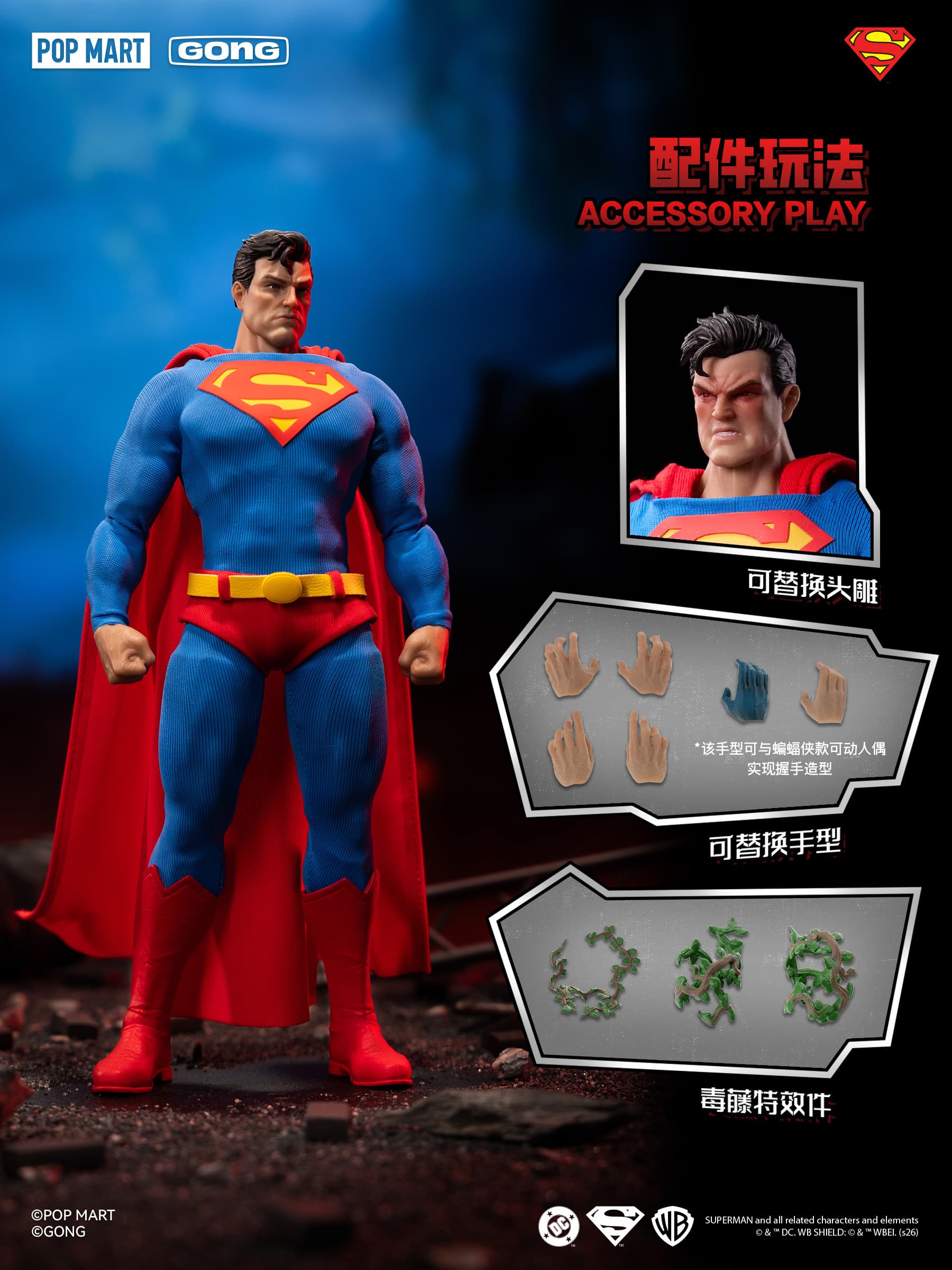 产品说明:《蝙蝠侠·缄默》系列 - 超人布衣可动人偶,产品内含:本体*1个(含头雕*1颗、握拳手*1对、布衣*1套),替换头雕*1个,替换手型*2对,造型右手*2只,毒藤配件*3个。